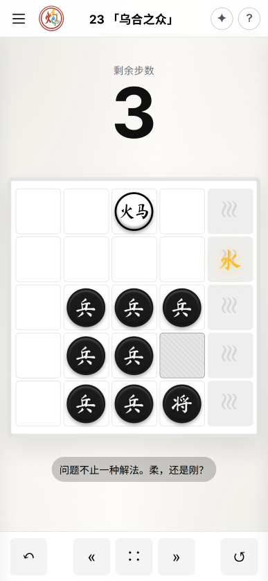 这是违背对弈类游戏的直觉的。要么一方走一子,要么和战棋游戏一样,双方的每个子,在一回合中都可以分别行动。但「我一动、敌多动」适合本游戏的闯关解谜机制:红方需要在N步之内获胜,这本来就不是一个机制对称的游戏——在大部分关卡中,红方甚至都没有帅/将,全是进攻子力。只要想通了这点,我便可以为敌棋设计简单、容易被玩家掌握的行动规则,同时灵活调整AI棋子的多少来打磨单个回合的压迫感和思考量。而「以少胜多」、「智胜蛮力」,也非常符合游戏主题。